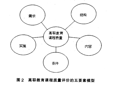 这五个要素应当是高职教育课程中最为重要、相互独立而又构成连续关系的方面,可作为高职教育课程质量评价指标构建的基础。首先,对高职教育课程的评价应当从需求开始,因为无论课程构建得如何完美,没有需求的课程是毫无价值的,当然如何界定“需求”是需要深入研究的问题。其次,条件与实施是使课程从文本走向现实、直接影响课程建设水平的关键因素,也应当作为高职教育课程评价的重要要素。可能存在争议的是“条件”是否应该作为一个独立要素。这取决于我们从什么角度审视“条件”,当我们完全围绕课程实施的需要进行条件建设时,就应当把它看作为课程的要素之一。再次,结构与内容本身是泰勒课程原理中的两个基本构成要素,只是在高职课程评价中应特别突出这两个要素,并具体界定其内涵,因为任务引领、项目驱动高职教育课程改革的重心便是课程组织模式与内容体系的改革。